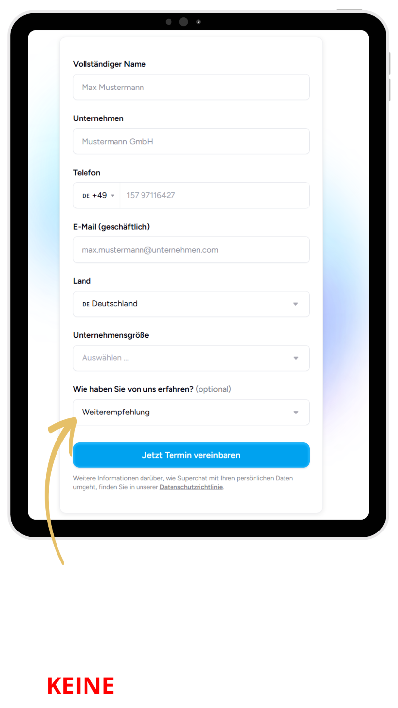 Bei der Eintragung zum Demotermin den Slot "Wie haben Sie von uns erfahren?" mit Weiterempfehlung auswählen, um Sonderkonditionen zu erhalten.